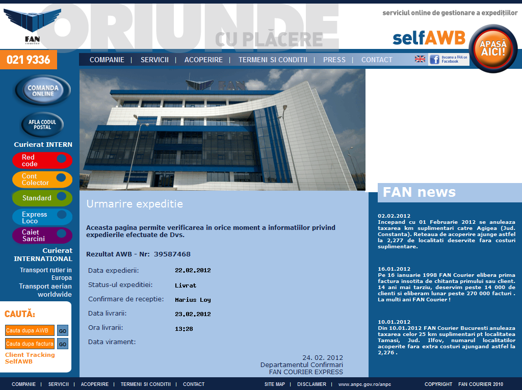 Parca plecase prin SIBIU, TIMISOARA, facuse turul tarii, si ma hotarasc sa verific AWB-ul de la Fan, pentru ca si eu lucrez cu el si eu stiu ca un colet plecat seara din Bucuresti ajunge a doua zi tocmai in Iasi. Aici era vorba de Bucuresti – Bucuresti.
